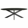 Ovale eettafel ‘New York’ is 240 cm lang en is uitgevoerd in het zwart. Het mangohouten blad is gezandstraald en behandeld met een zwarte lak. Het tafelblad is 3 cm dik. Onder het tafelblad zit een metalen matrixpoot die is afgewerkt met een zwarte lak.