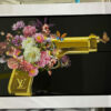 Het schilderij toont een prachtig gouden wapen dat schittert met prachtige details. Het is omringd door een muur van het iconische Louis Vuitton-patroon, wat een gevoel van verfijning en exclusiviteit toevoegt aan het ontwerp. Deze combinatie van een gouden wapen en het Louis Vuitton-patroon creëert een unieke esthetiek die zeker de aandacht zal trekken.
